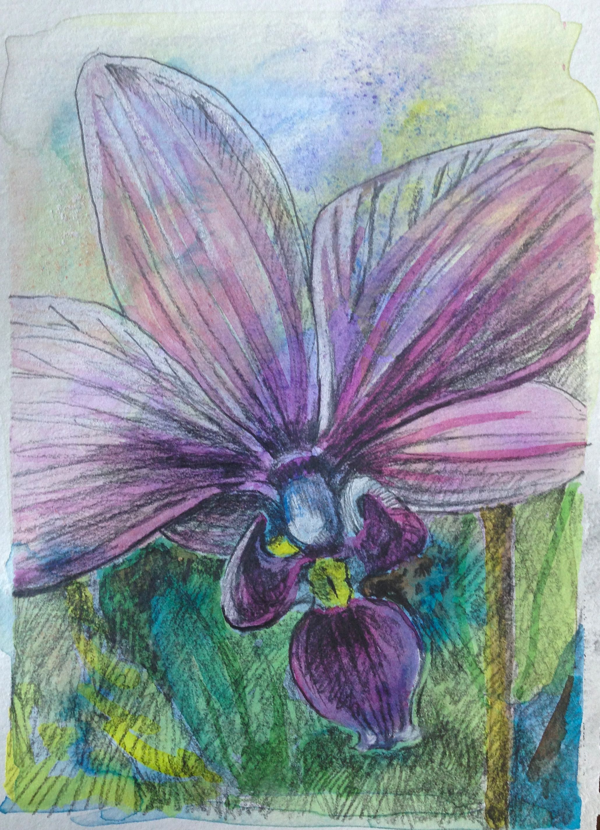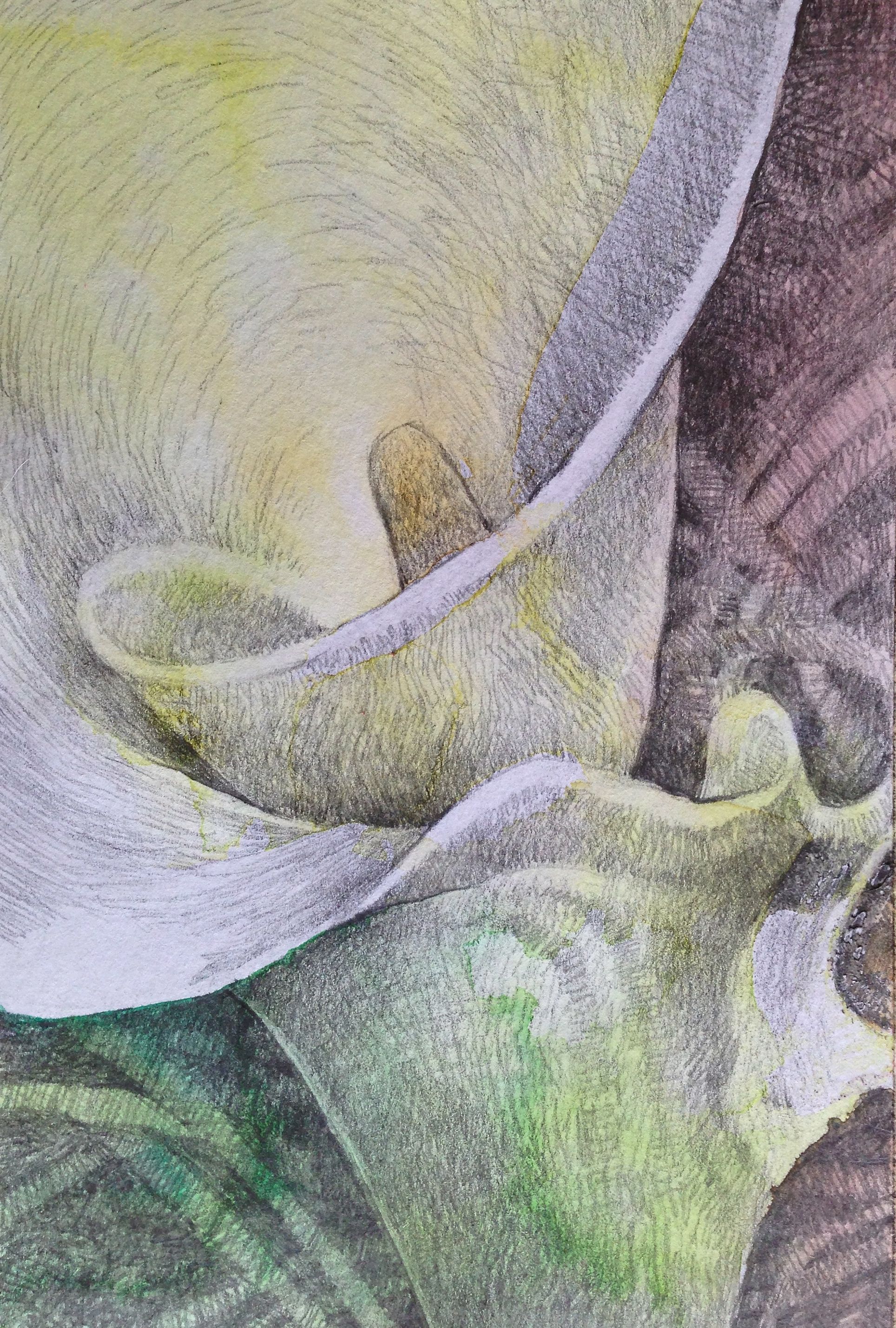 Much happier with the watercolor and graphite medium. I think the pastels are going to have to go into the bottom of the tool box for now. I am working with controlling the watercolor under the graphite…while still allowing the watercolor to do it’s own thing. Some areas were blocked out with rubber cement in order to maintain some white show through. This seems to work well…although hard to be too detailed with it…but that is probably a good thing for me. I am going to do two more watercolor grounds at the same time for the next two pieces. I like the idea of working on more than one at a time. I have one ground that is waiting for me…I just haven’t been inspired yet by the subject. I am really drawn to the shape and curve of the calla lily.