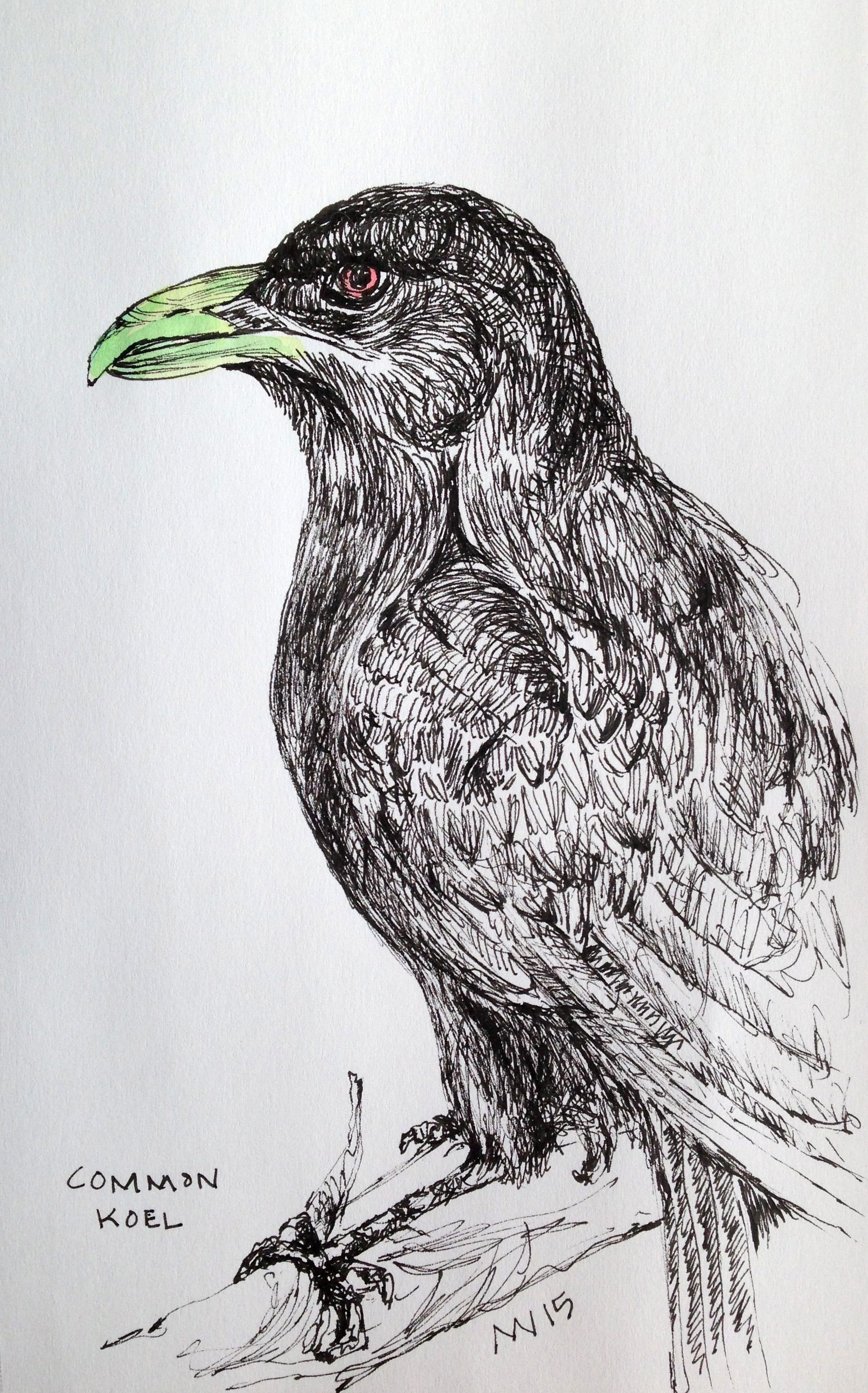 So hard not to break the rules sometimes! I love, love, love the ink only drawing. But, sometimes it is just impossible for me not to add a little color. This Koel bird was a prime example. I drew this from a black and white only image from the Animals, Mammals, Bird, Fish, Insects etc. book I have been using. I decided to look the bird up to just learn some more about it, and the images I found show the bird with brilliant red eyes and a green toned beak. The sketch was begging for the color.