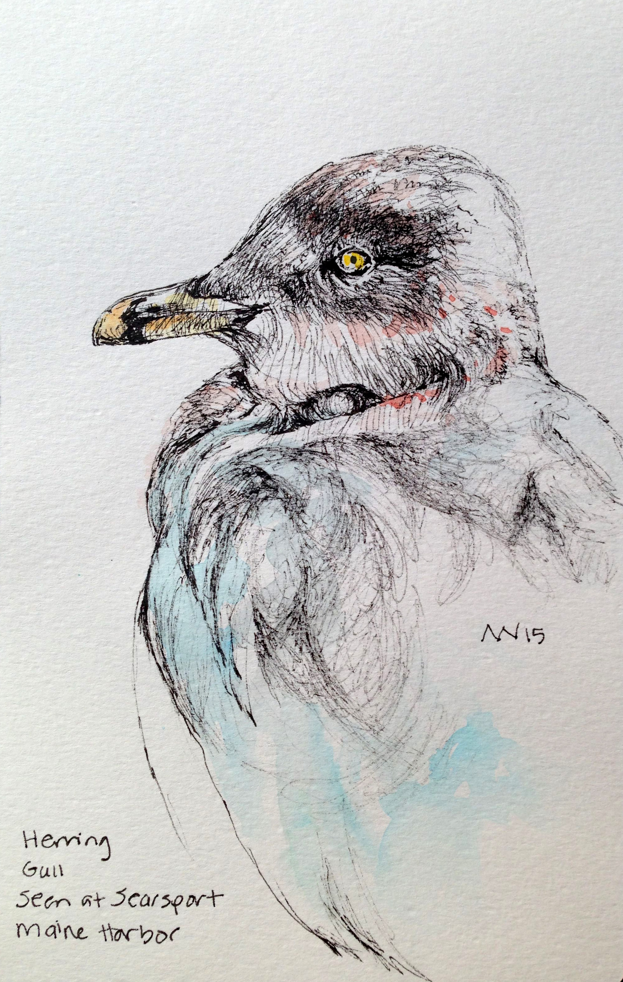 This week at #sketchbookskool is with Cathy Johnson. I love her work and I really like her lessons. First homework assignment was birds (or a squirrel, or some little creature). Unfortunately there isn’t a bird in site right now due to all the snow we are getting, but luckily for me I take a lot of photos. These gulls were at the Searsport Harbor a couple of years ago, I have always admired them and thought they would make nice painting subjects. Gulls are not as easy to draw as one might think.