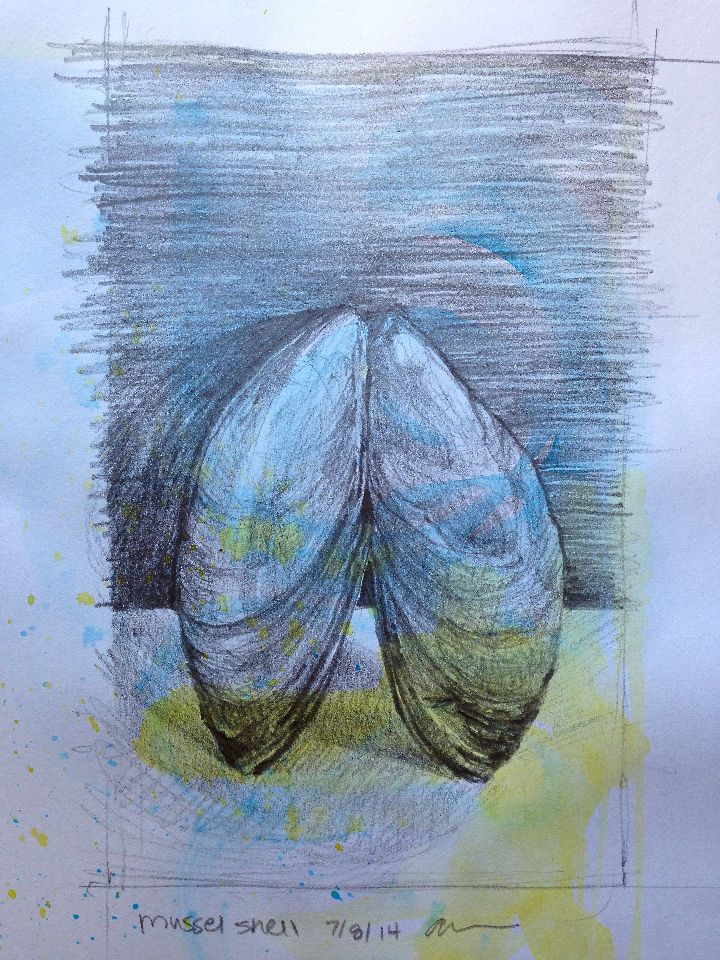 All of the sudden I decided to change it up! I think that I was inspired by this photo that I took of the super moon (I think it was July 7 or 8). The photo itself didn’t turn out, but the scene in person was pretty awesome. We had gone out on the boat with friends to watch the fireworks from the water…when I turned and looked back there was all this water churning up behind the boat and this really big moon with a super reflection. So, in order to keep the memory I did take a photo…which is working as a good reference. I think I will do several of these as paintings and drawings. The encaustic painting was really fun to do. It’s not my usual style…but I found it very liberating!