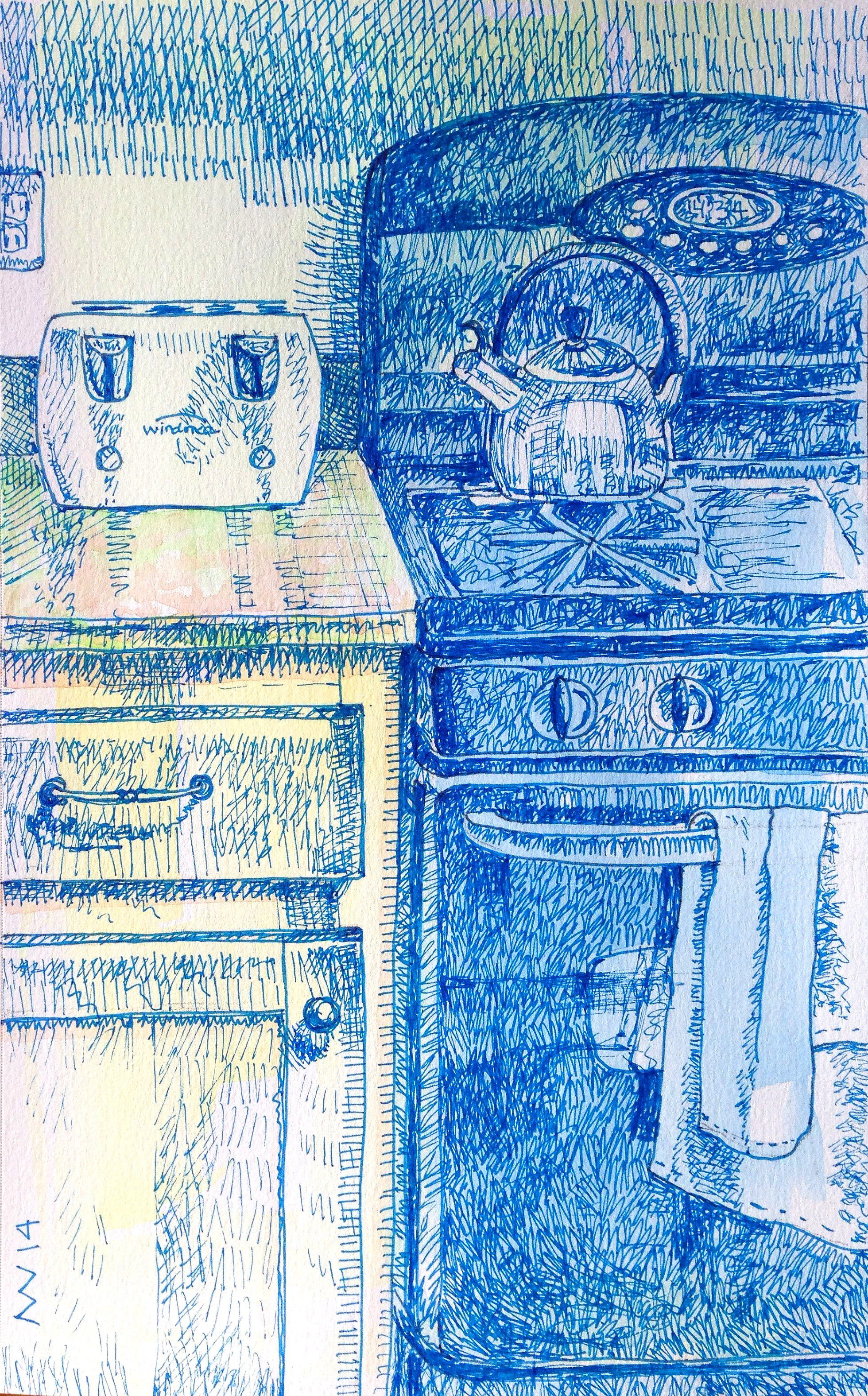So, I ditched the shells on the counter idea. I did a quick sketch with a pineapple on the counter–which I liked, but all the proportions were off. The shells just didn’t look right on the counter, so off they went. In the end, I decided to block in the color first, so I put on a wash of a medium blue for the stove, a yellow for the counter and light green for the wall. This made me feel better. I started in with the stove and worked out from that. The pineapple was next to the toaster, but by the time I got over there, I couldn’t squeeze it in!